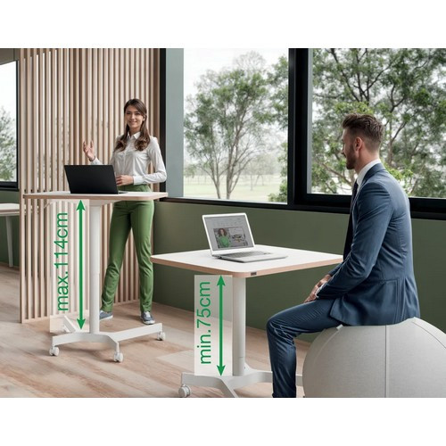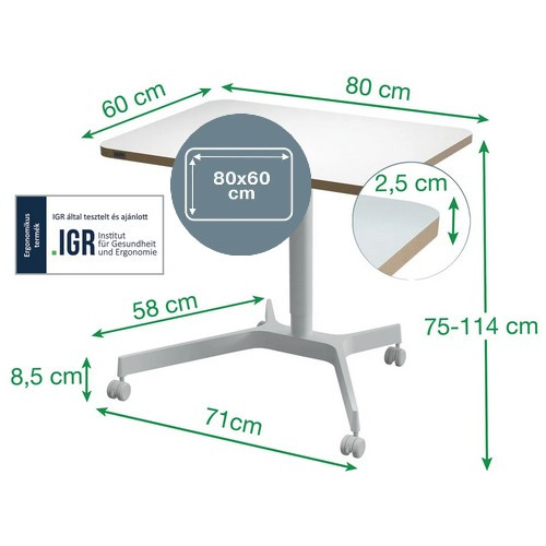 | Rövid leírás a termékről | Állítható magasságú asztal - téglalap alakú, mérete: 60×80×2,5 cm (ma×sz×mé), az asztallap forgácslapból készült, acél konstrukció, egyéb funkciók: állítható magasságú, kerekekkel, teljes súlya: 11 kg